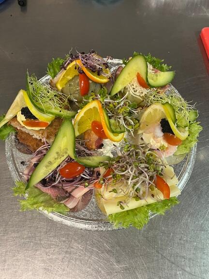 Rugbrød - franskbrød- smør - æg & rejer - fiskefilet- rullepølse - hønsesalat- flæskesteg - ost med peberfrugt